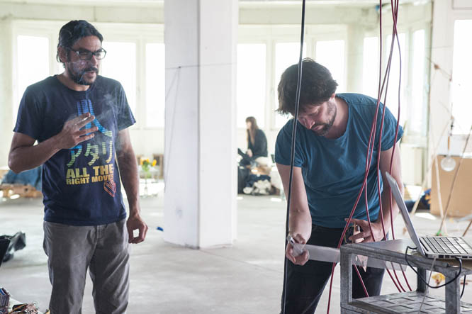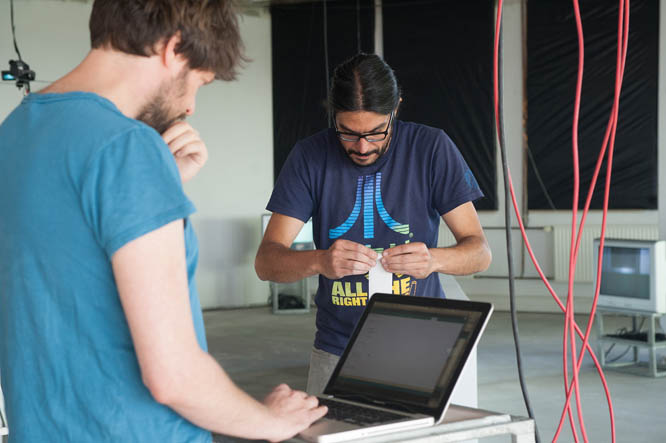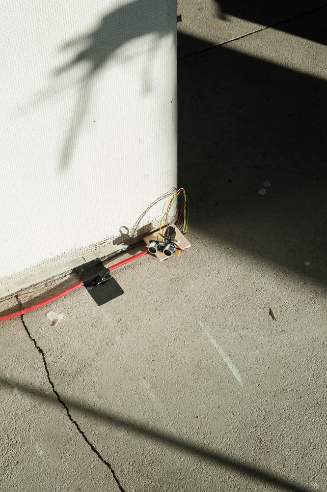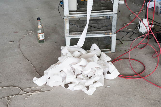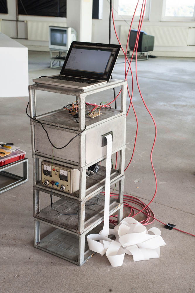 Input/Ouput Interactive Installation, in cooperation with Wissam Khaled. Context: Pala Fruits, a collaborative lab by Zona Dynamic. more images We connected 4 sensors to 4 other installations (COLOR to a video feedback installation, DISTANCE FIELD to a distributed objects installation, CAPACITY to an installation consisting of metal parts hanging from the ceiling, AUDIO VOLUME to a video). Then we created a sentence from the values, representing the current state of the exhibition. Lonely excitement shines perfectly? Materials used: metal, arduino, red cable, sensors, printer.